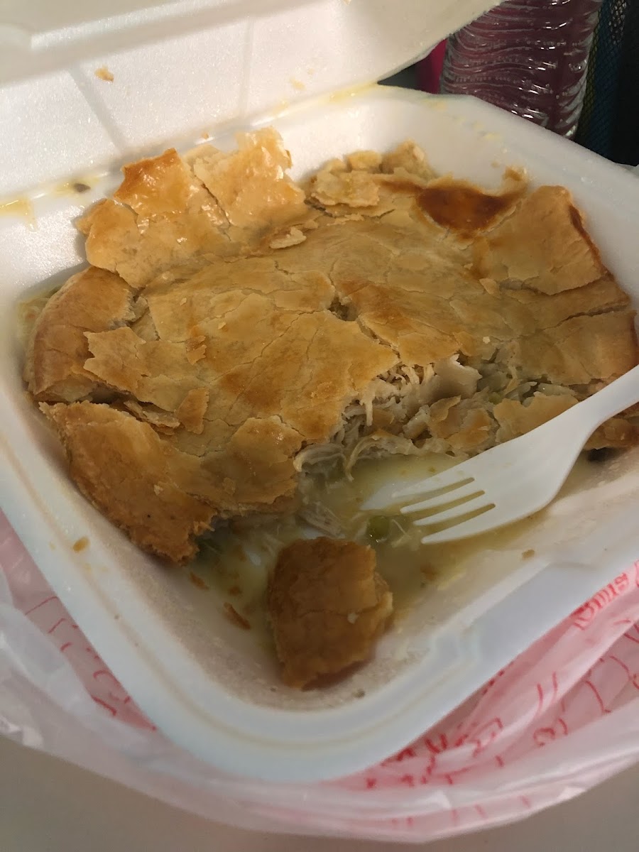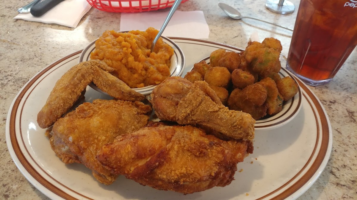 I got the fried chicken with brown gravy, rice with brown gravy, mac and cheese, and baked potato all this for $16 not bad. Food portion is large and so filling.